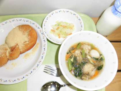 「きな粉揚げパン、肉団子入り春雨スープ、キャベツサラダ、牛乳」です。