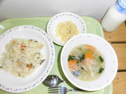 「ホワイトピラフ、ジャーマンポテト、野菜スープ、牛乳」です。