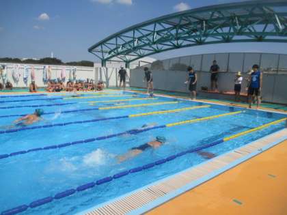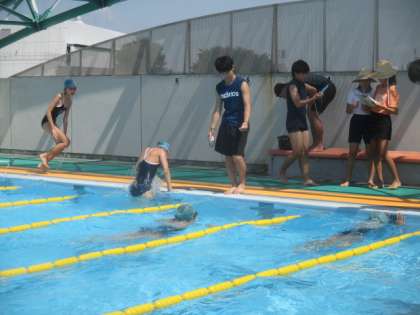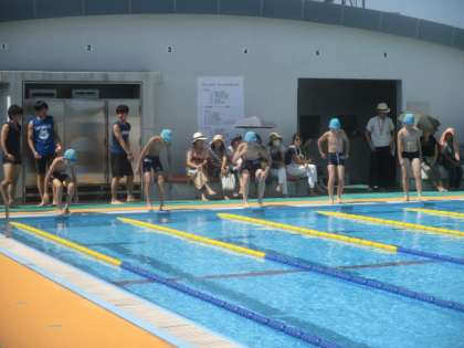 記録会のスタートです。エントリーした種目で順番に記録をとっていきます。待っている間の子どもたちの表情には硬さが見られましたが、良い意味での緊張感は好記録につながります。友だちのチャレンジに周りからは自然と歓声が上がり、泳ぎ切った6年生の表情には、達成感で満ち溢れていました。
