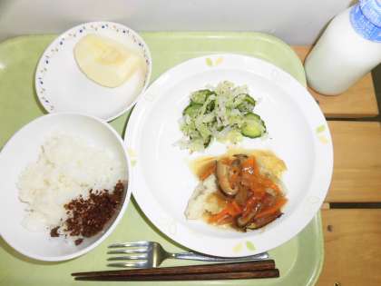 「ごはん、かつおでんぶ、白身魚の甘酢かけ、野菜のゆかりかけ、りんご、牛乳」です。