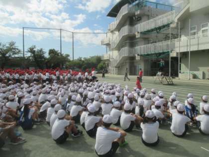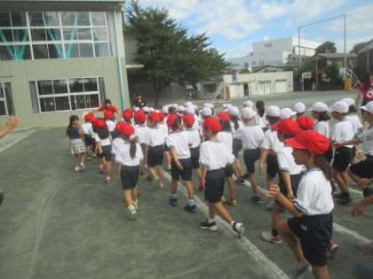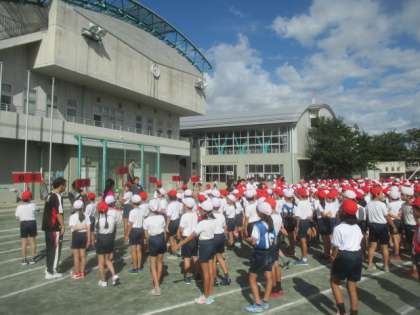 今朝の体育朝会は、運動会に向けて、全校での赤白に分かれた並び方と、行進の仕方を練習しました。体育主任の利根川先生の号令のもとで、全校児童がきちんと行動でき、短い時間で整然とした動きができていました。来週からは、本格的な全校練習も始まります。