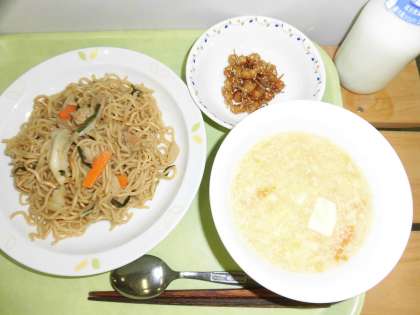「ソース焼きそば、大豆とじゃこの甘辛揚げ、中華風コーンスープ、牛乳」です。