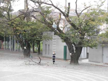 毛虫が発生している桜の木の枝おろしを、主事さんたちがしてくれました。校庭の桜は巨木なので、登って切るのは大変危険なのですが、命綱をつけて慎重に作業にあたりました。これで少しは毛虫の心配も減ると思います。主事さんたち、本当にご苦労様です。