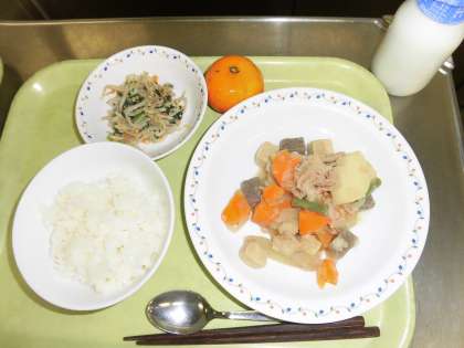 「ごはん、肉じゃが旨煮、野菜のごま味噌かけ、冷凍みかん、牛乳」です。