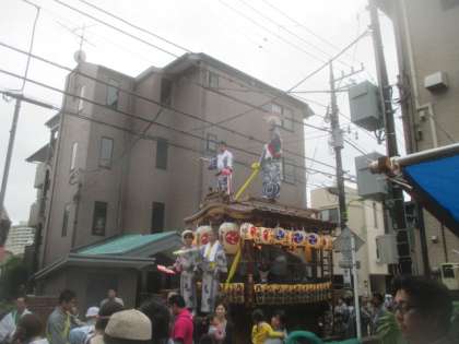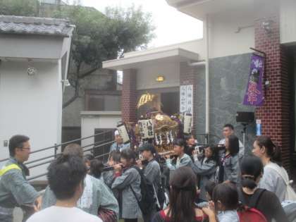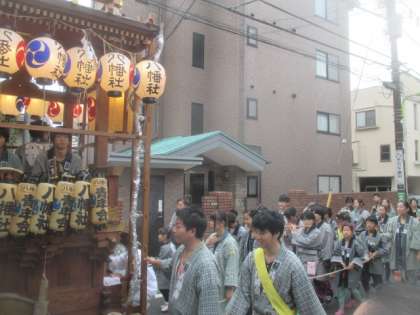 いよいよ神輿や山車が出発します。今年は子ども神輿も出て、八幡山小の子どもたちが協力して担いでいました。山車には幼稚園の子どもたちもたくさん集まり、みんなで町内を巡行します。