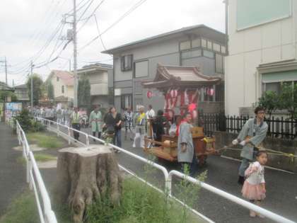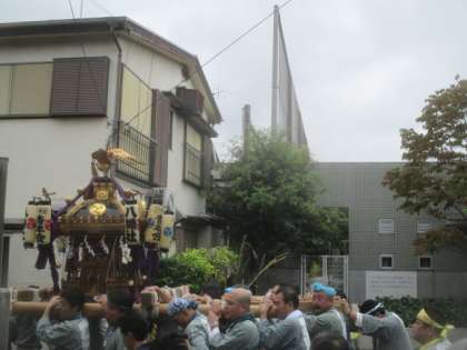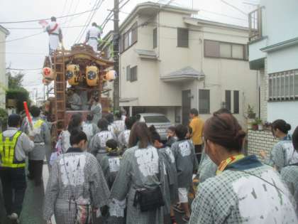 狭い路地を進む山車は、住宅の屋根に届きそうな位の高さで、町会の方が声をかけて誘導しています。子どもたちの側には、常に保護者の方々が付き添って同行しました。少し日差しも出てきましたが、気温が上がらず、とても気持ちのよい陽気で、巡行は順調に進みました。