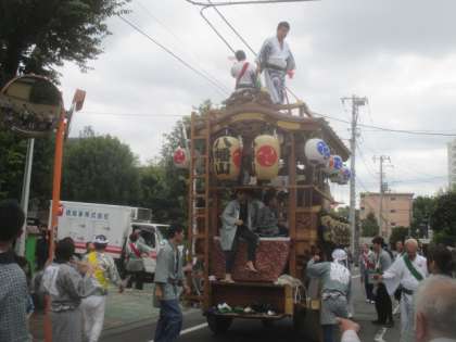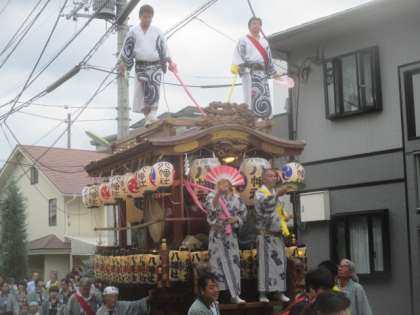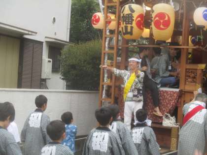 山車の上では子どもたちがお囃子を演奏しています。日々の練習の成果を発揮していました。一行は順調に町内を廻り、いよいよ祭礼も終盤に入りました。