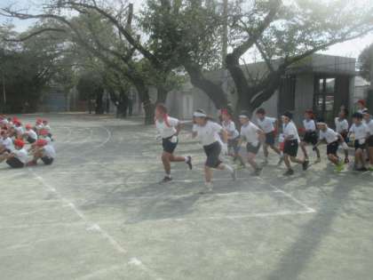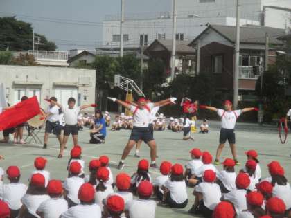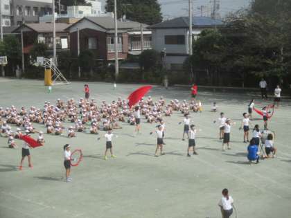 後半は応援合戦の練習です。担当の先生の指示に従って、応援の隊形に移動しました。応援団の威勢のよいかけ声とともに、校庭は運動会さながらの雰囲気になりました。
