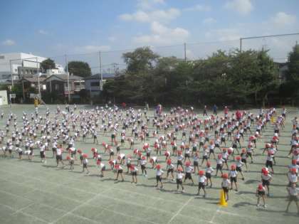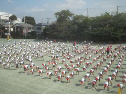 最後にもとの隊形に戻って、はじめの運動の練習です。担当の利根川先生の指導の下でラジオ体操を行いました。朝の太陽の日差しが照り付ける中でのおよそ1時間、みんなしっかり取り組むことができました。