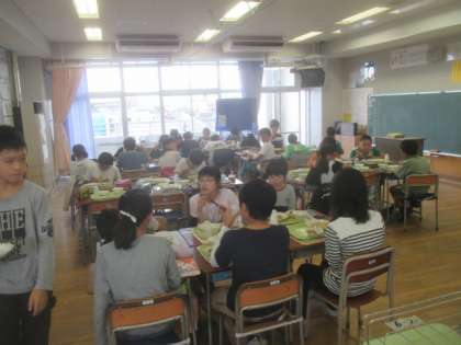今日も高学年は元気です。おいしい給食は、子どもたちの楽しみな時間。今日もおかりの争奪戦あり、楽しくおしゃべりをしながら食欲も進み、どのクラスも食缶はきれいに空っぽになりました。