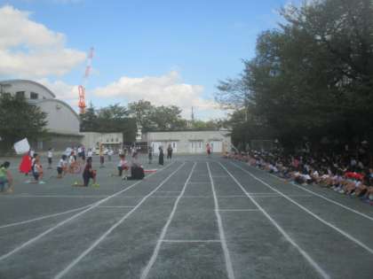 昨日の雨で延期になった運動会の全校練習の3回目が、秋晴れの空の下で行われました。まずは、応援合戦の練習です。毎日練習に励んでいた応援団を中心に、本番さながらに気合いを入れて行いました。