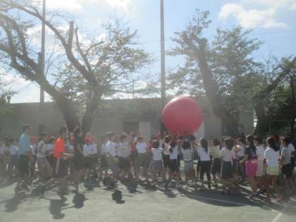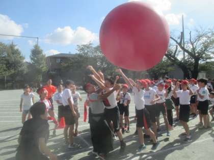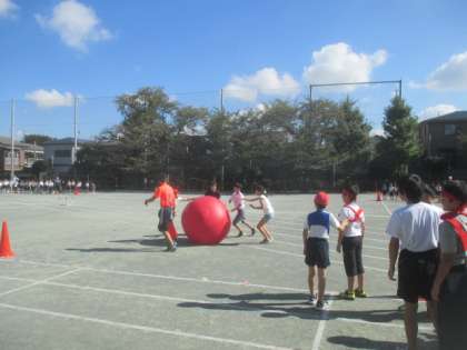 次に、全校競技「大玉送り」の練習をしました。全校児童入場のところから行い、各学年でトラックを囲んで、競技の隊形に並びます。ルールを確認しながら、実際に2回戦行いました。今日は赤組の勝利でしたが、明日の本番はどうなることでしょう。