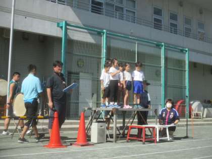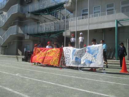 最後に開会式の練習を、入場から通して行いました。1年生代表の「はじめの言葉」も、立派に言うことができていました。代表委員のスローガンの発表や、キャラクターの紹介も上手にできました。明日の本番では、緊張しないで自信をもってやってください。
