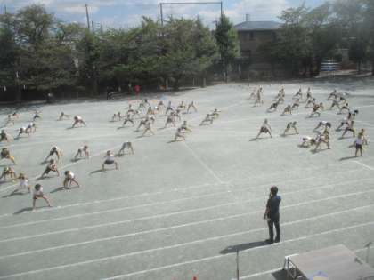 全校練習の後は、学年ごとに時間が割り振られてのリハーサルが行われました。その様子は、地域の方の協力を得て、上空からドローンで撮影されました。どの学年も、明日の本番を前に、最後の調整ができました。