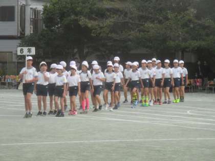 運動会が始まります。児童の入場です。応援団長を先頭に、子どもたちは元気に行進します。6年生は小学校生活最後の運動会になります。入場してくる子どもたちの表情も真剣そのものです。