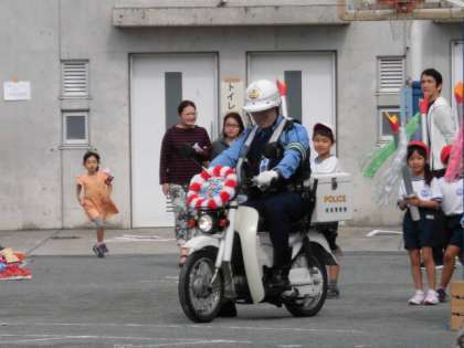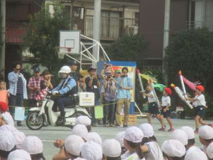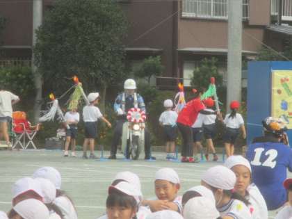 開会式の最後に、作年度から行われた聖火入場が今年も行われました。各学年の代表児童が聖火ランナーとして、八幡山小学校運動会の聖火を受け渡していきます。先導にご協力いただきましたのは、今年も八幡山駐在所の武藤巡査長さんです。