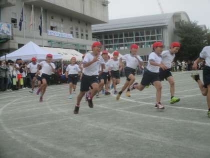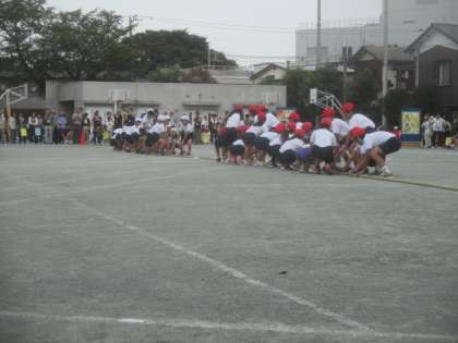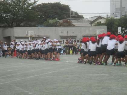 4年生の団体競技は、「お助けつなひき」です。紅白それぞれ2チームに分かれ、助けに入るチームが走り、綱をひくチームの後ろに駆けつけます。いち早く助けに入れた方が、競技を有利に進められます。白熱した攻防が繰り広げられました。