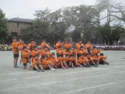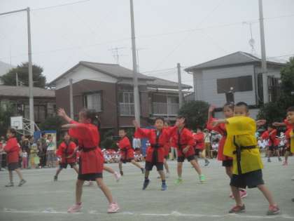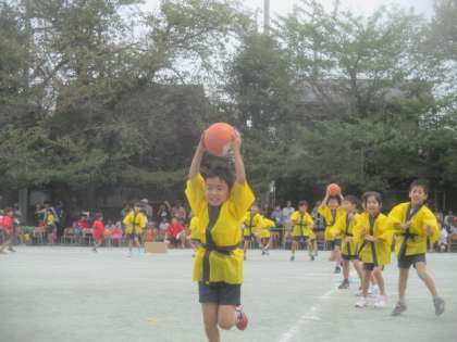 1年生は初めての運動会。最初の演技は、表現種目『摩訶不思議 八小アドベンチャー』です。ドラゴンボールの歌に合わせて、リズムよく舞い踊りました。ボールをキャッチも上手にでき、練習の成果が出ました。3色の衣装も素敵で、1年生らしい元気なダンスでした。