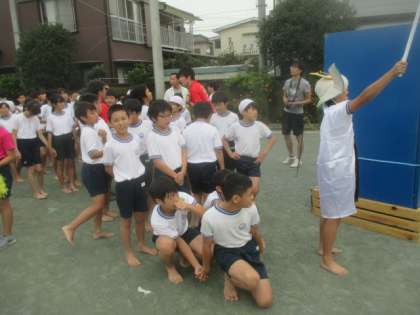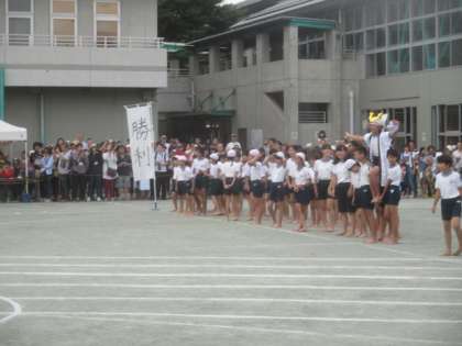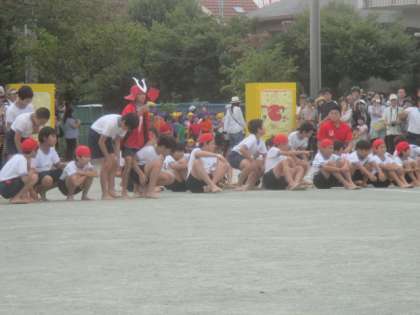 高学年の最初の種目は、騎馬戦です。入場前の気合を入れて、いざ出陣です。