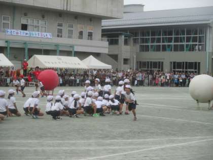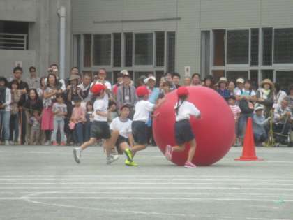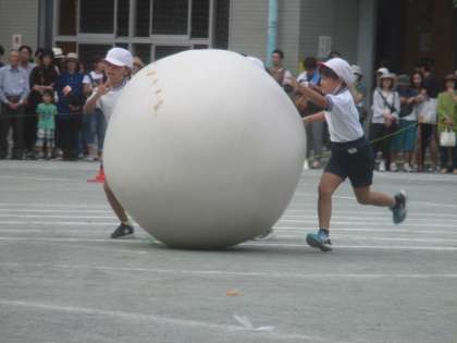 2年生の団体競技は、大玉ころがしです。数人でグループになって、自分より大きな大玉を協力して運びます。台の上に乗せるのに四苦八苦しましたが、最後まであきらめずにがんばりました。