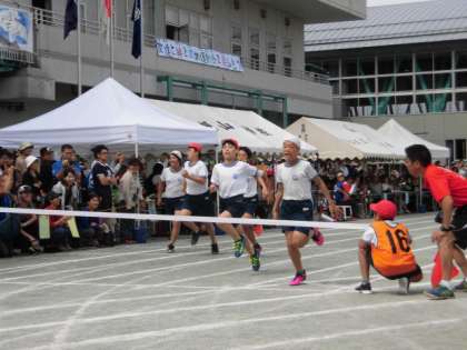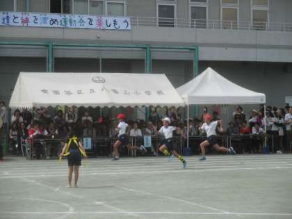 6年生の短距離走は100mです。小学校最後の運動会の徒競走。みんな全力で走り切りました。さすが6年生となると、走りにも迫力があります。レースが進むにつれ、会場からの歓声も自然と大きくなっていました。