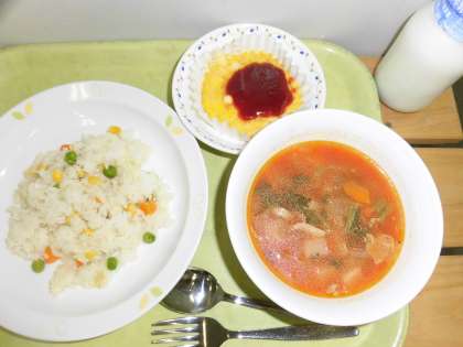 「三色ピラフ、チーズ入り卵焼き、ミネストローネ、牛乳」です。