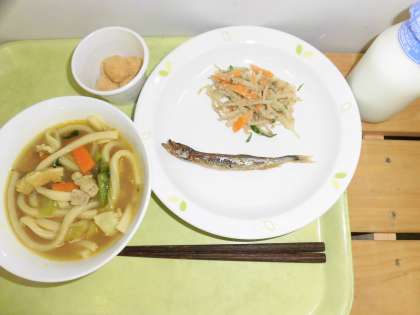 「カレーうどん、焼きししゃも、もやしのごま和え、月見団子、牛乳」です。