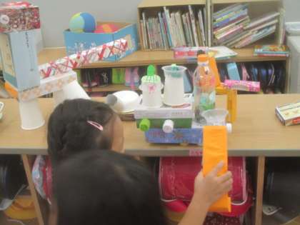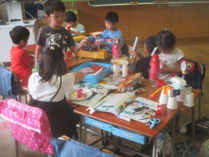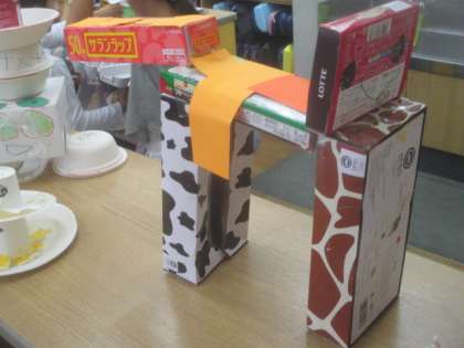 1年2組の教室では、図工の時間でいろいろな箱や容器を使って動物を作りました。題して「どうぶつむらのピクニック」。ライオンやキリンなど、いろいろな動物がロッカーの上に飾られていました。子どもたちは、楽しく作業に集中できました。