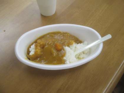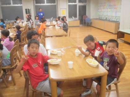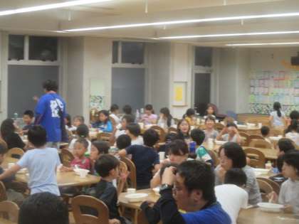 ひとしきり遊んだ後は、夕食の準備です。今晩は、子どもたちの大好きなカレーライスです。準備のお手伝いもみんなで協力します。全員そろったところで、「いただきま〜す!」