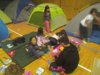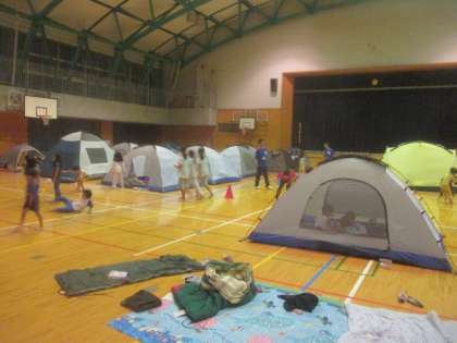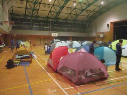 体育館は暑くも寒くもなく、過ごしやすい環境です。学校からは利根川教諭も参加し、今夜は楽しいお泊まりになりそうです。