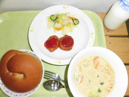 「明日葉パン、豆腐ナゲット、ポテト入りフレンチサラダ、チーズのふわふわスープ、牛乳」です。