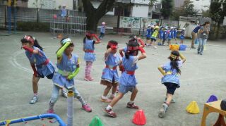 今日は運動会ごっこでたくさん遊びました。年長さんに、忍者の衣装を借りて踊りを教えてもらって、年少さんが楽しそうでした。また、年長さんが優しく自信をもって教えてあげていて微笑ましかったです。