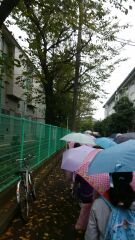 3年生の社会科見学は、小雨の中、学校を出発しました。道路の歩き方やマナーがよく、バスに乗り込むことが出来ました。