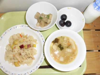 「秋の香りごはん、里芋の甘辛煮、味噌汁、巨峰、牛乳」です。