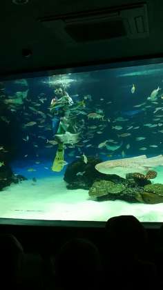 エイのいる大きな水槽では、ちょうど、飼育員のダイバーさんが、餌付けのところを見学出来ました。飼育員さんに手を振って貰いました。