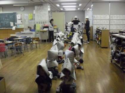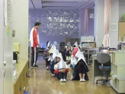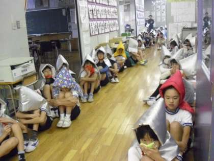 今月の避難訓練は、職員室が火事で放送機器が使えないという想定で行われました。主事さんたちが、各フロアを回って出火を伝えると、子どもたちは先生の指示をしっかり聞いて行動していました。今日は雨で校庭に出られず、オープンスペースまでの避難でしたが、どのフロアも静かに待つことができていました。大変立派でした。