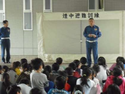 全体の避難訓練の後、4年生は、烏山総合支所地域振興課防災係の方々のご協力をいただき、煙に対する避難方法の体験学習をしました。火災発生時の避難で気をつけることとして、煙を吸い込まないようにする、見通しの悪い煙の中をどやって逃げるかを、実際に煙の中を移動して学びました。子どもたちは、とても有意義な体験をすることができました。