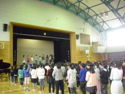 学校の57才の誕生日を祝い、全校児童で『ハッピバースデー 八幡山』を歌って、最後に校歌でしめくくりました。