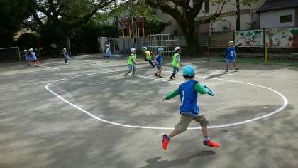 先生が、ドッジボールやリレーのラインを引いてくれると、あっという間に遊びが始まります。