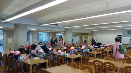今日は、八幡山幼稚園の年少さんが八幡山小学校のランチルームを訪問してお弁当を食べました。