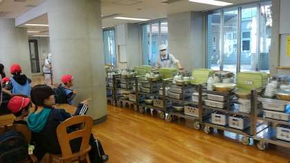 八幡山幼稚園のランチルーム訪問では、給食室から、たくさんのワゴン車が運ばれる様子を見学しました。小学校の子どもたちもなかなか見ることの出来ないワゴン車の行列を見ることが出来ました。