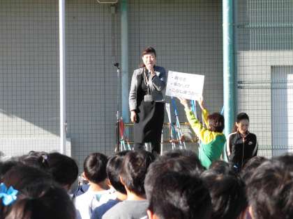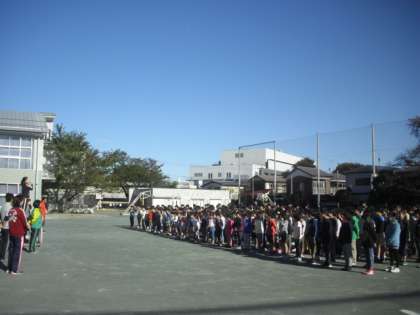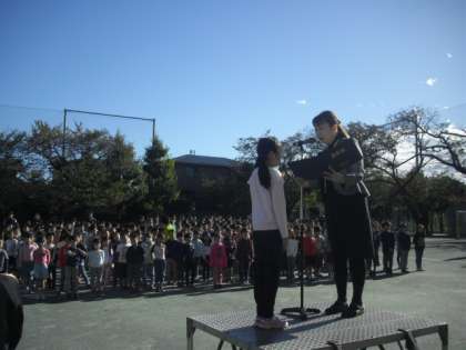 台風一過の爽やかな秋晴れの下、全校朝会が校庭で行われました。校長先生からは、「江戸しぐさ」についてのお話がありました。また、4年生の友達が、歯と口の健康に関する「図画・ポスター展」に入賞し、表彰されました。