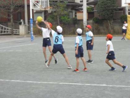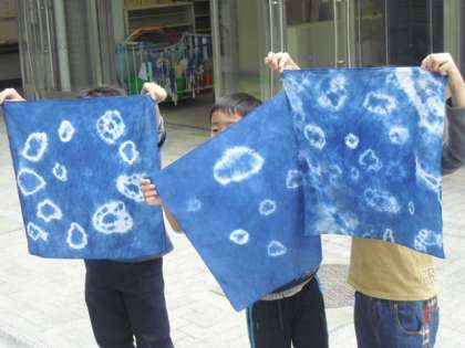 校庭では、サッカークラブやバスケットボールクラブの子どもたちが、楽しくゲームをしていました。その傍らでは、科学クラブの子どもたちが取り組んだ藍染めの布を乾かしていました。上手にできて、みんな大満足で表情でした。