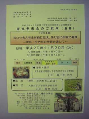 来る11月29日(水)に、平成28・29年度「世田谷9年教育」研究開発校の指定を受けての研究発表会を開催いたします。関係の皆様におかれましては、公私ご多用のこととは存じますが、ご参会を賜り、ご指導いただきたくご案内申し上げます。