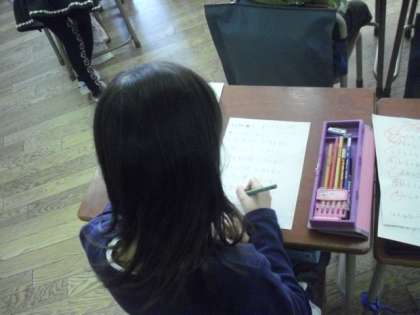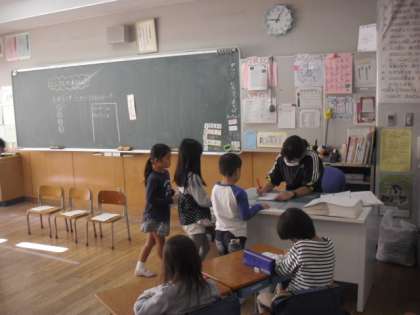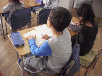 2組では、1時間目は算数の授業。たし算の練習問題をたくさん解いていました。できた問題は先生に見てもらいます。学芸会の練習もがんばっている1年生ですが、算数の授業も一生懸命に取り組んでいました。