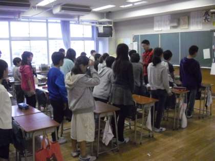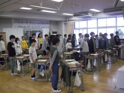 今朝の音楽朝会は体育館で行う予定でしたが、インフルエンザの流行が心配されたため、急遽放送による歌唱指導としました。明後日の学芸会に向けて、「学芸会の歌」を放送で流し、音楽の先生のアドバイスを受けて、全クラス一斉に歌いました。各フロアから歌声が聞こえてきて、いつもと違った音楽朝会になりました。