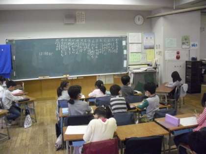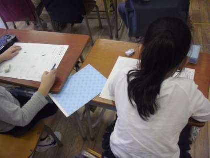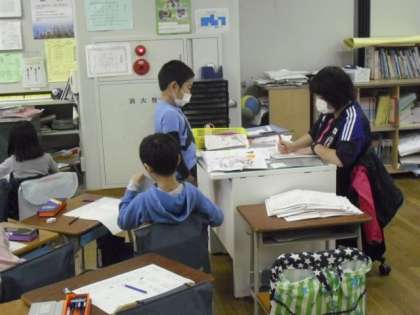 1組では、国語の授業で漢字の復習と、のばす音のプリント学習を行いました。先生にできた課題を見てもらいながら、たくさん書いて覚えました。どの子もていねいに書けていました。