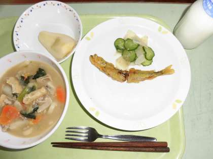 「味噌煮込みうどん、ししゃものカレー天ぷら、大根ときゅうりのごま風味、ラ・フランス、牛乳」です。