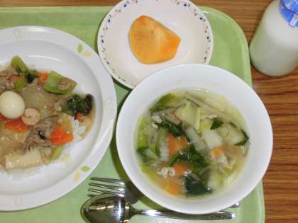 「中華丼、中華スープ、柿、牛乳」です。