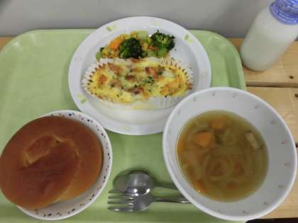 「フレンチエッグ」は、蒸したじゃが芋で作ったマッシュポテトを小判型に敷き詰め、その上に、ハム、牛乳、生クリームを加えた卵液を流し、チーズとパセリをふりかけて、オーブンで焼きます。今日はきれいに焼き色がつき、卵の部分はふわふわに、美味しく仕上がっていました。